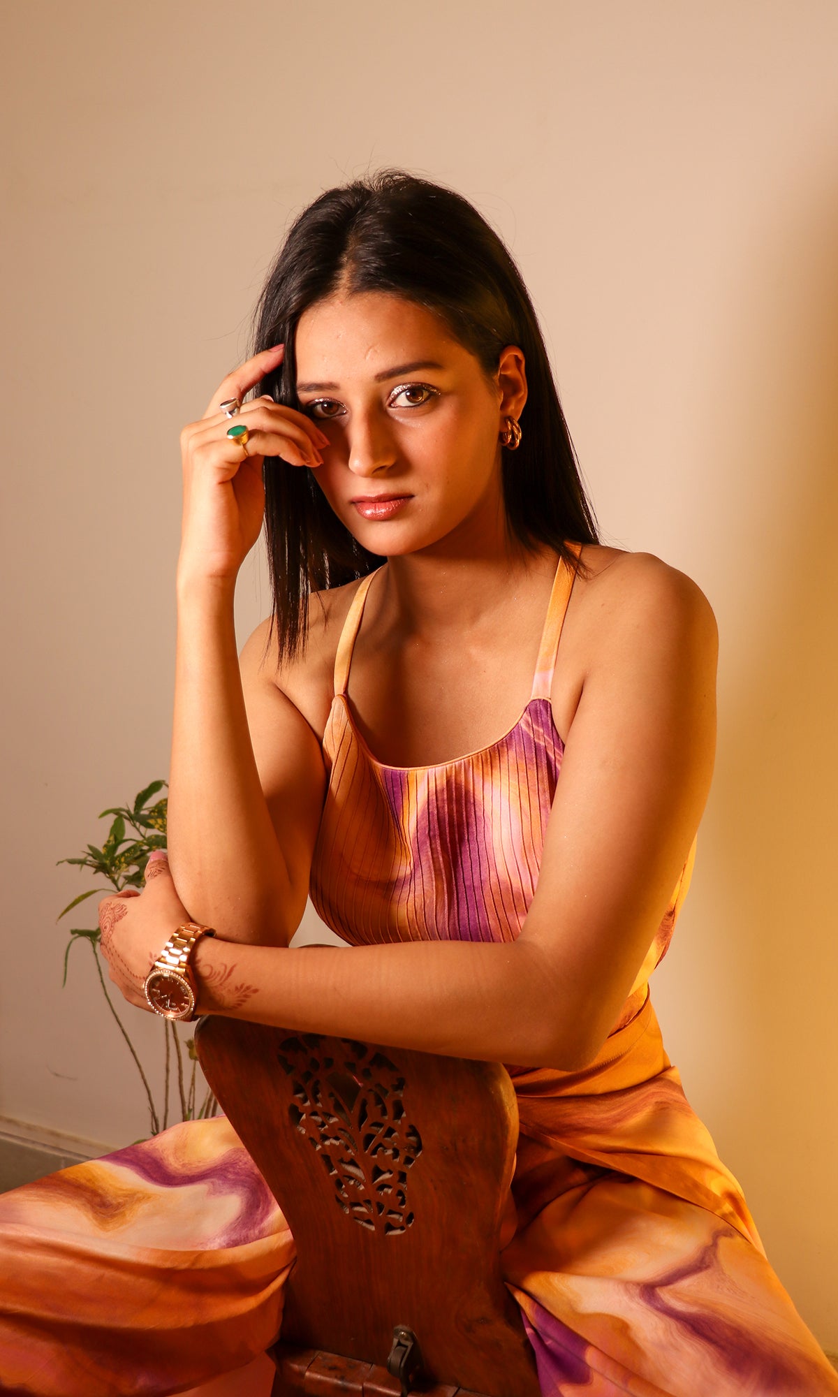 A digitally printed wrap-around jumpsuit crafted in soft cotton satin, featuring delicate pintuck detailing on the yoke. The silhouette ties gracefully at the waist, creating a flattering fit that moves with ease. An elegant blend of colour, comfort, and craftsmanship- perfect for days that call for effortless sophistication.