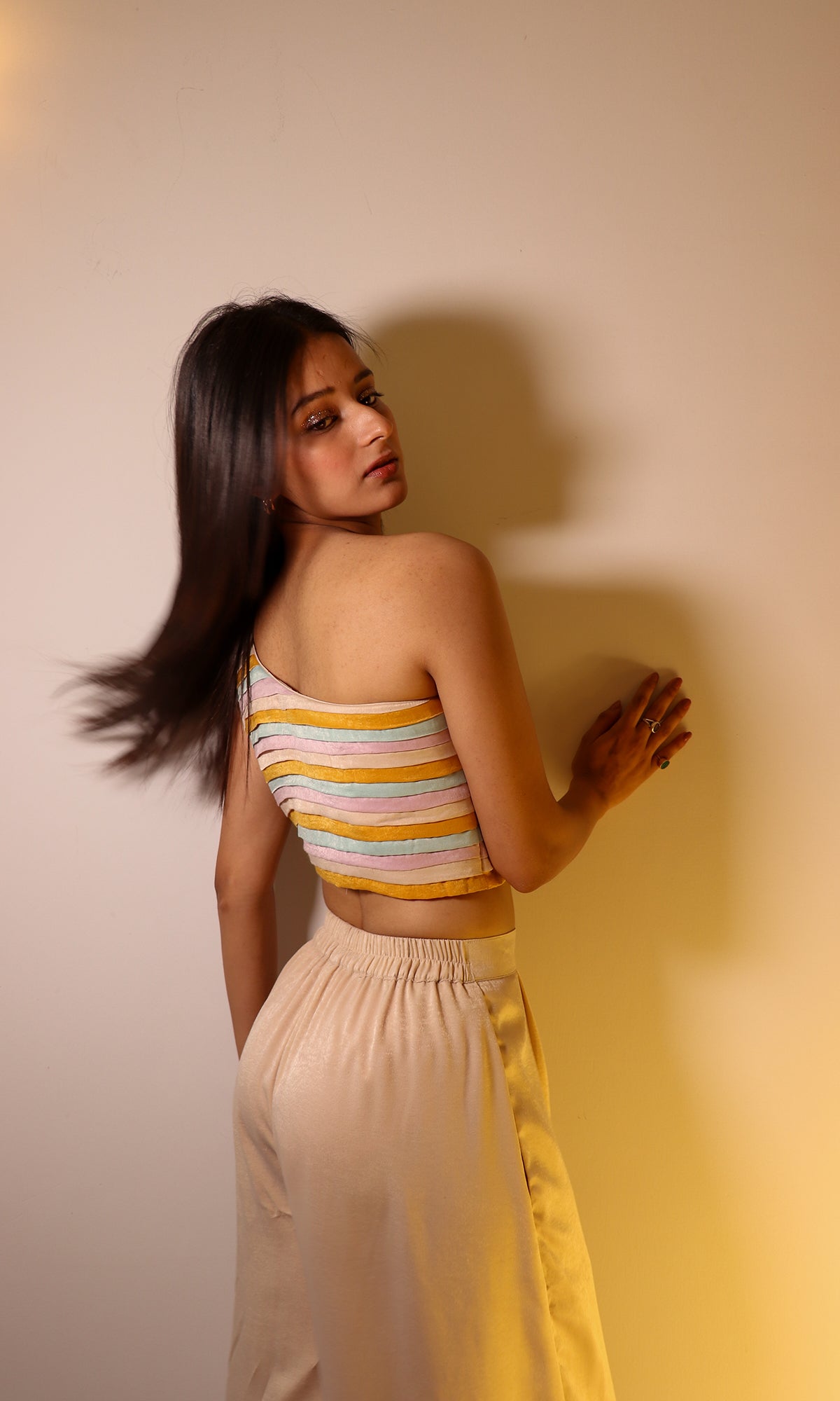 A one-shoulder sandwash satin top featuring soft multi-coloured pleating, paired with flared pants. Playful yet poised- this set transitions effortlessly from brunches to evening gatherings, adding a hint of understated glamour.