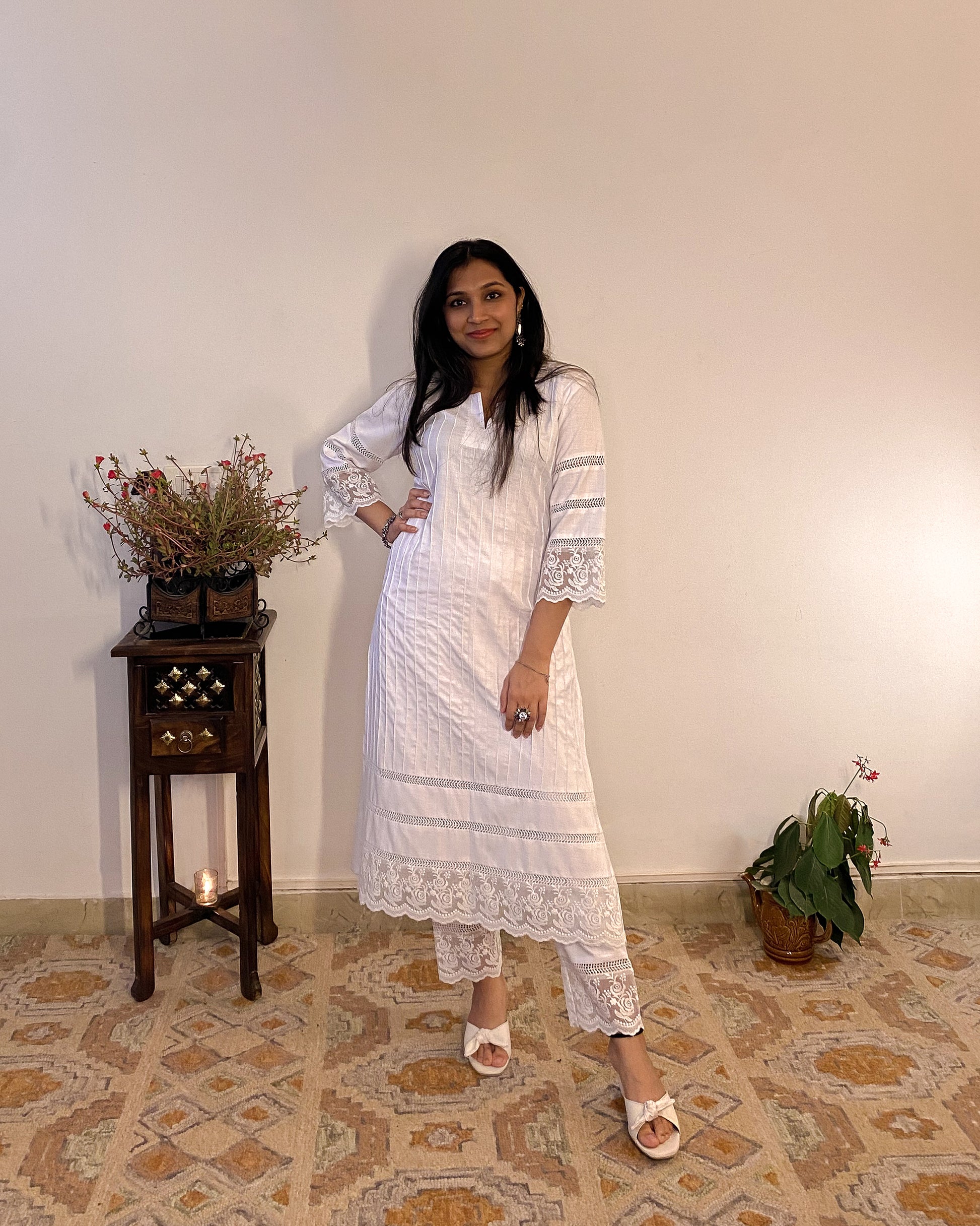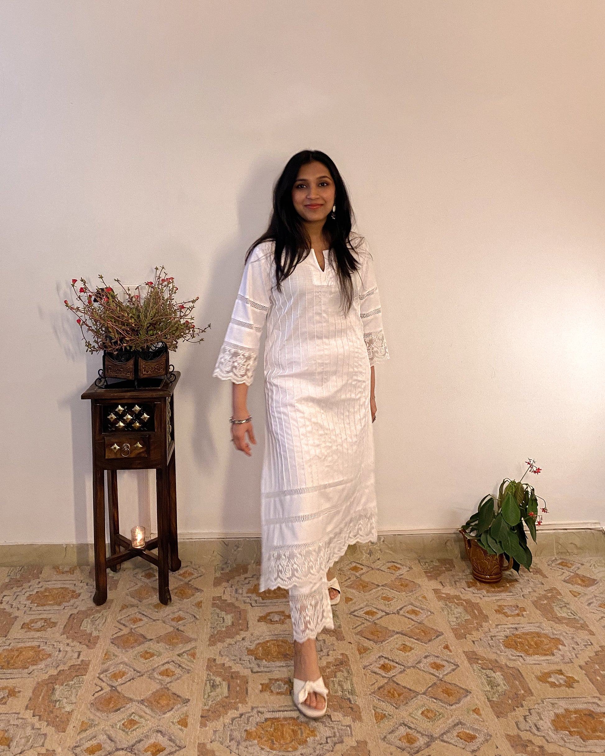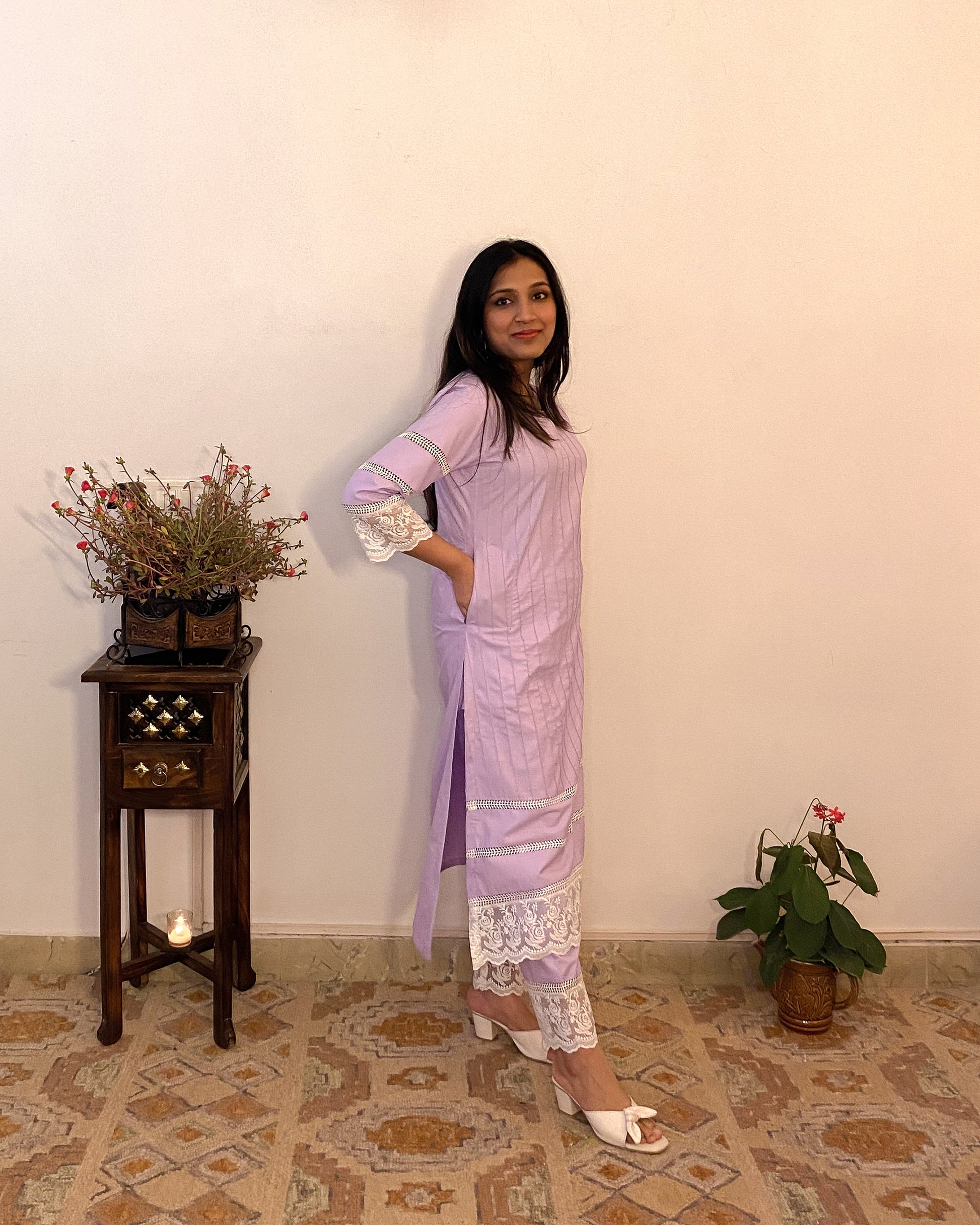 Crafted for everyday elegance, the Parinaaz set is made using a breathable cotton blend, this A-Line Kurti features a round neckline with a delicate slit, pin tucks, and embroidered lace detailing. With its subtle jali design and practical pockets, this handcrafted outfit combines style and comfort for any occasion.