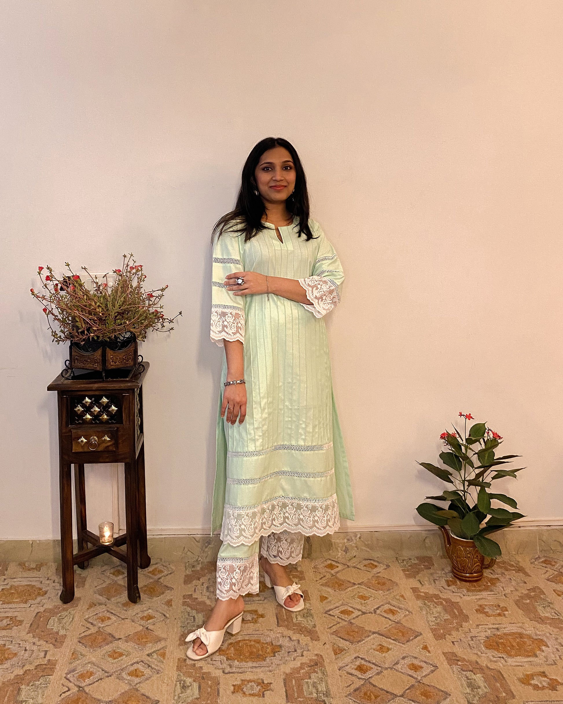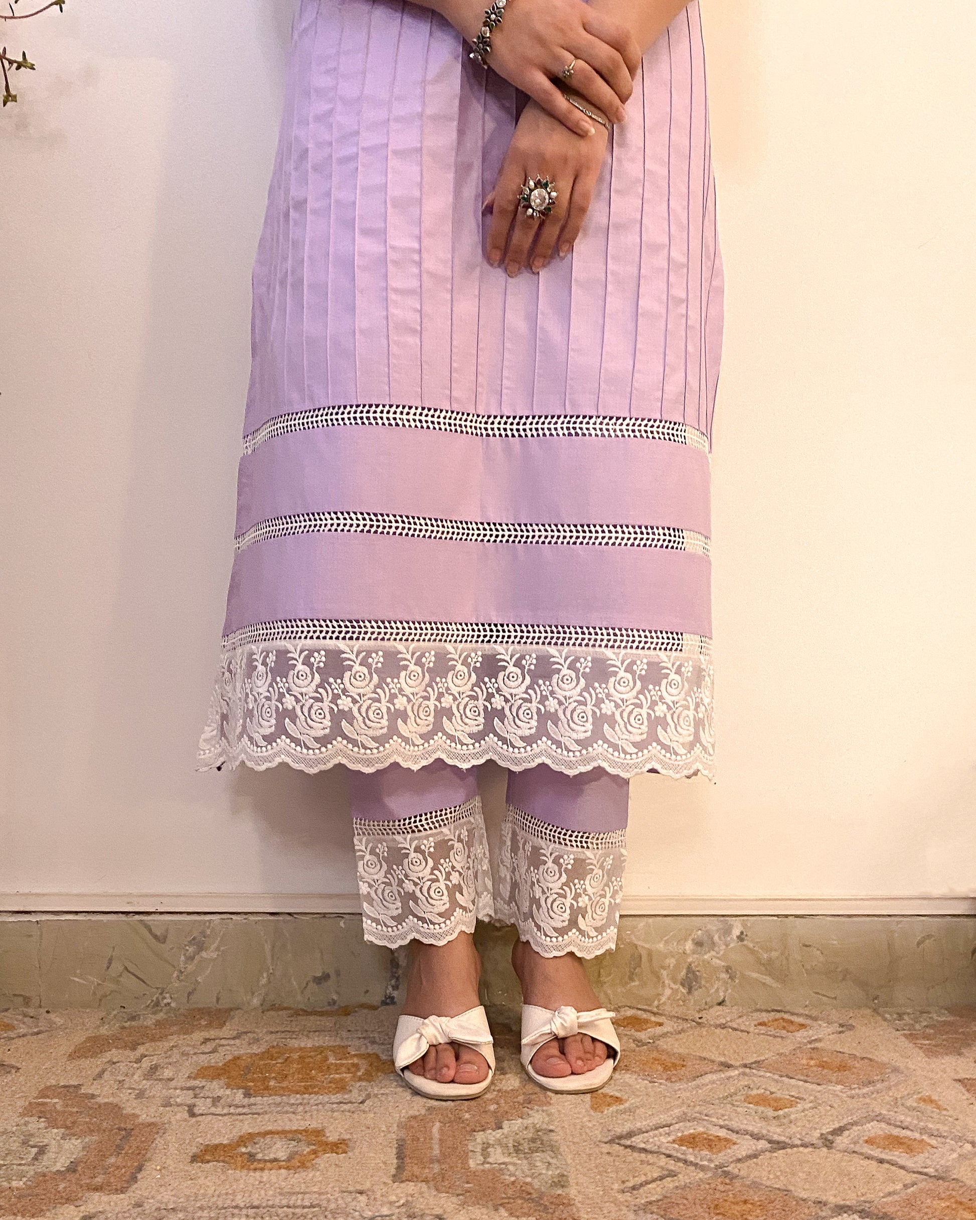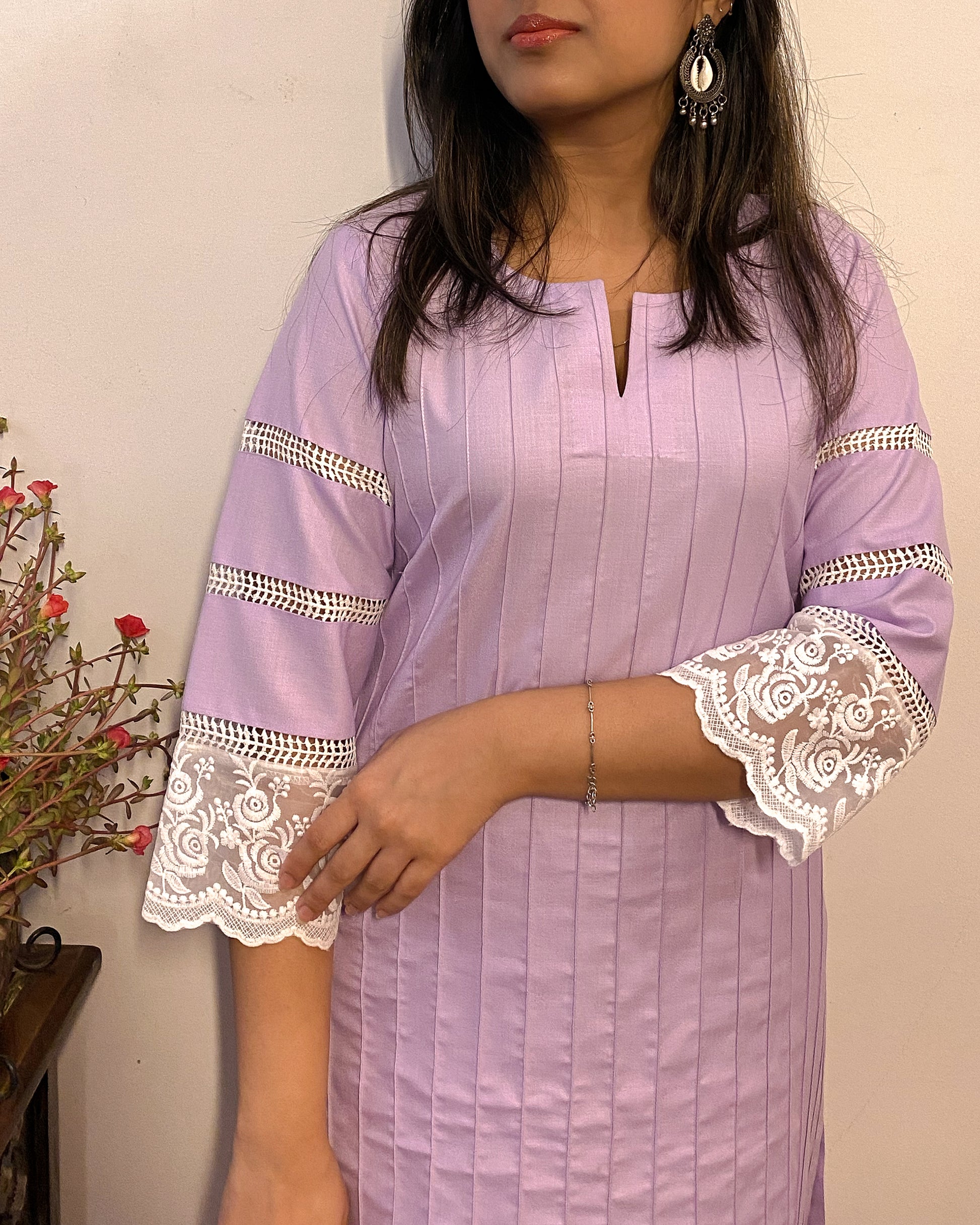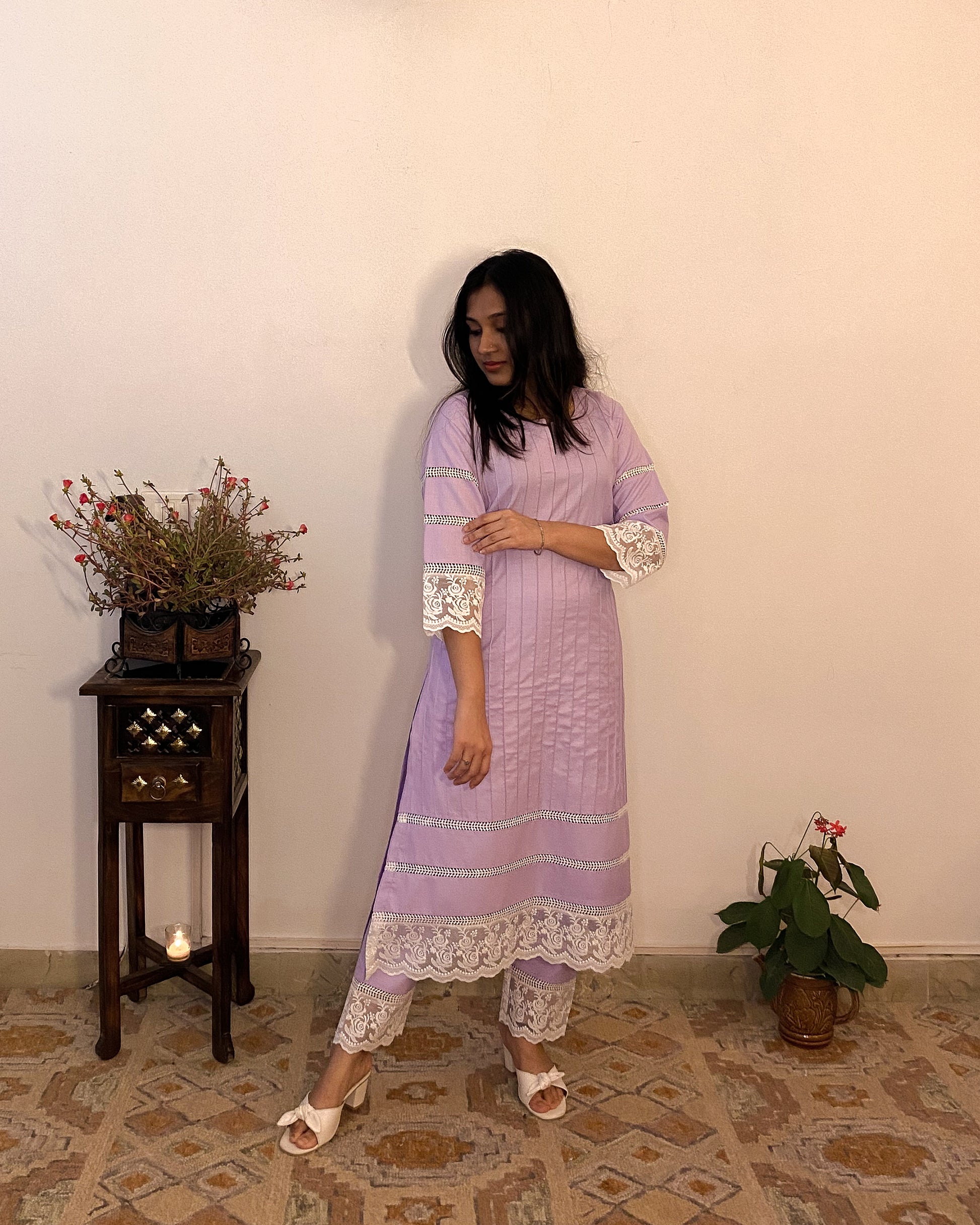 Crafted for everyday elegance, the Parinaaz set is made using a breathable cotton blend, this A-Line Kurti features a round neckline with a delicate slit, pin tucks, and embroidered lace detailing. With its subtle jali design and practical pockets, this handcrafted outfit combines style and comfort for any occasion.
