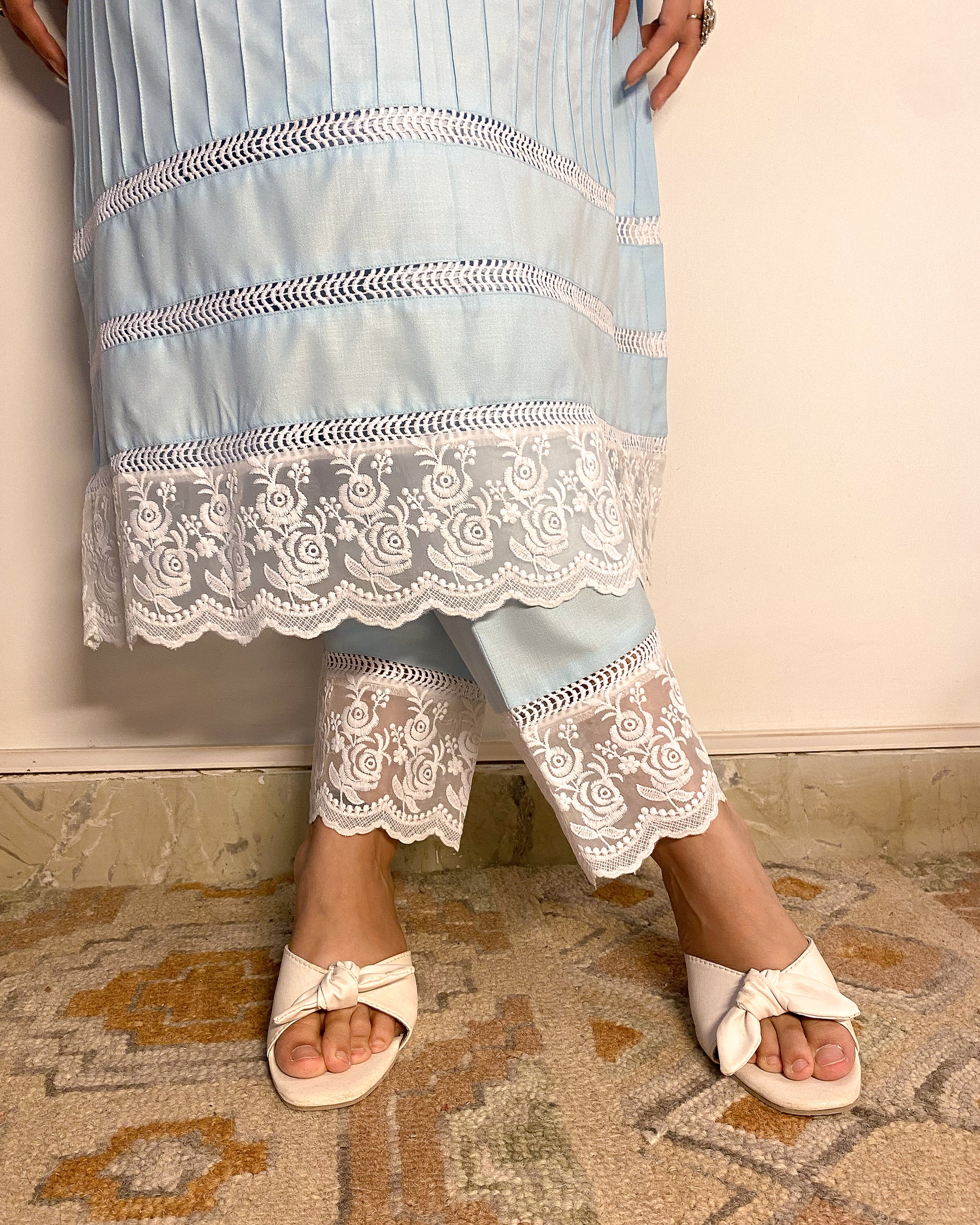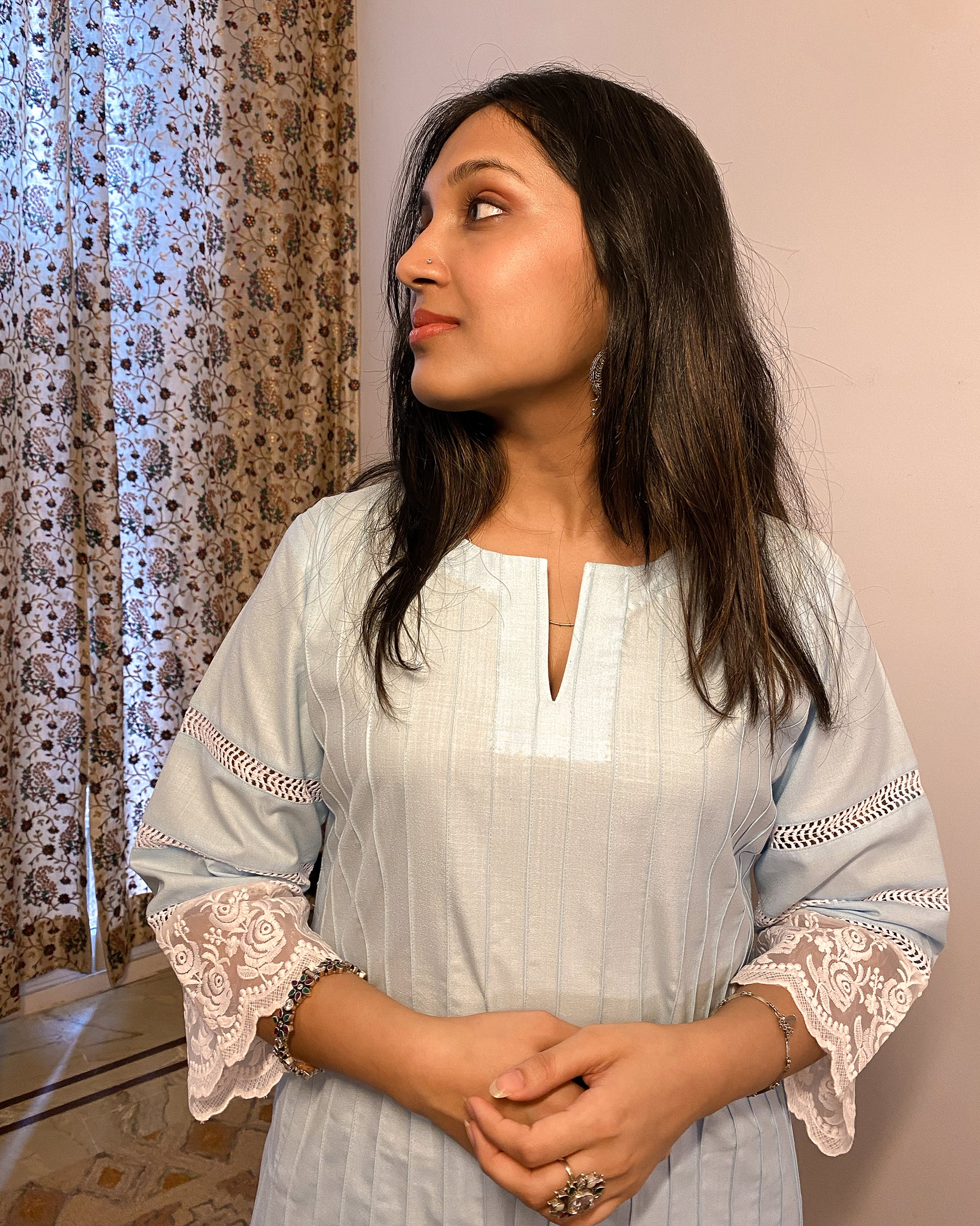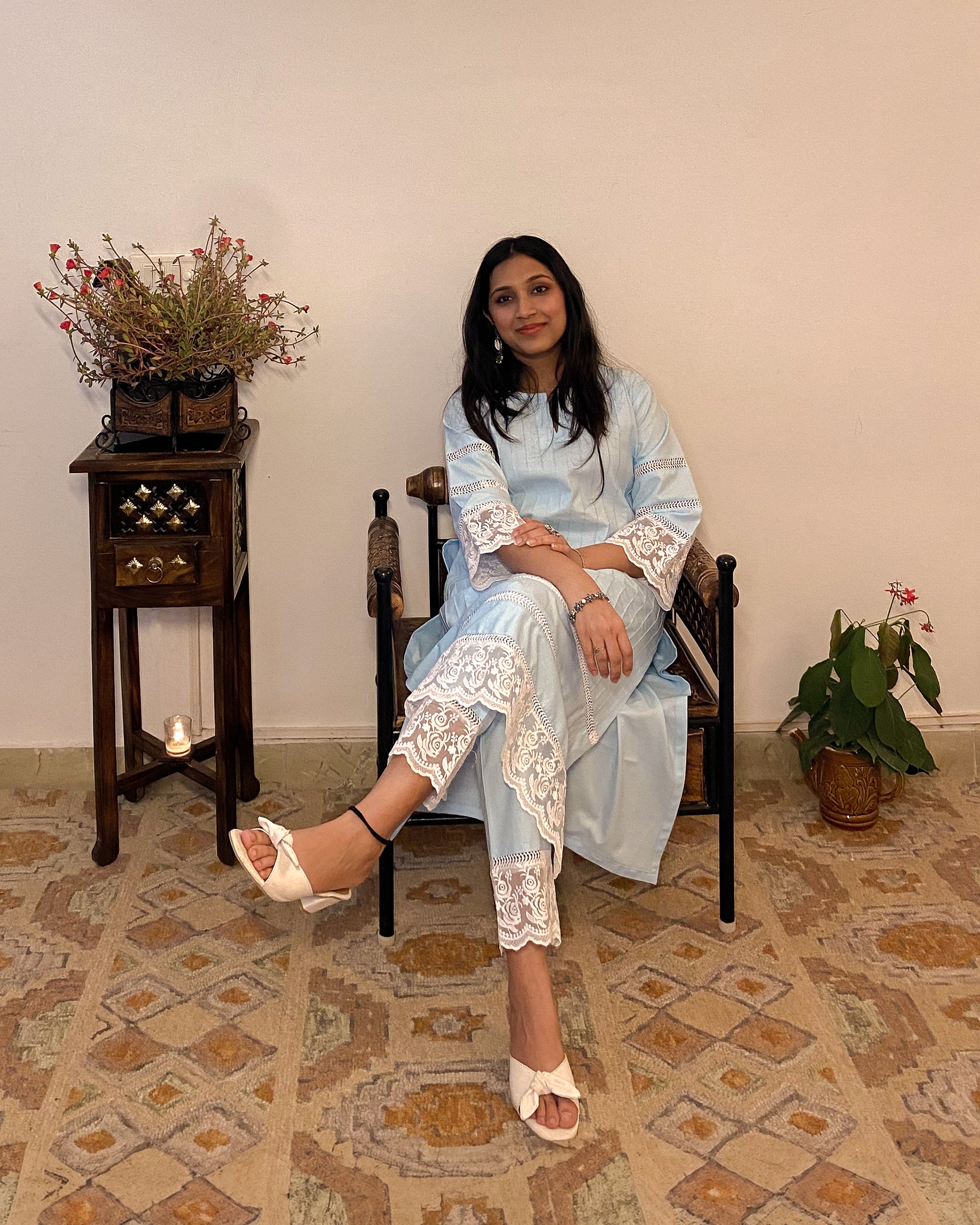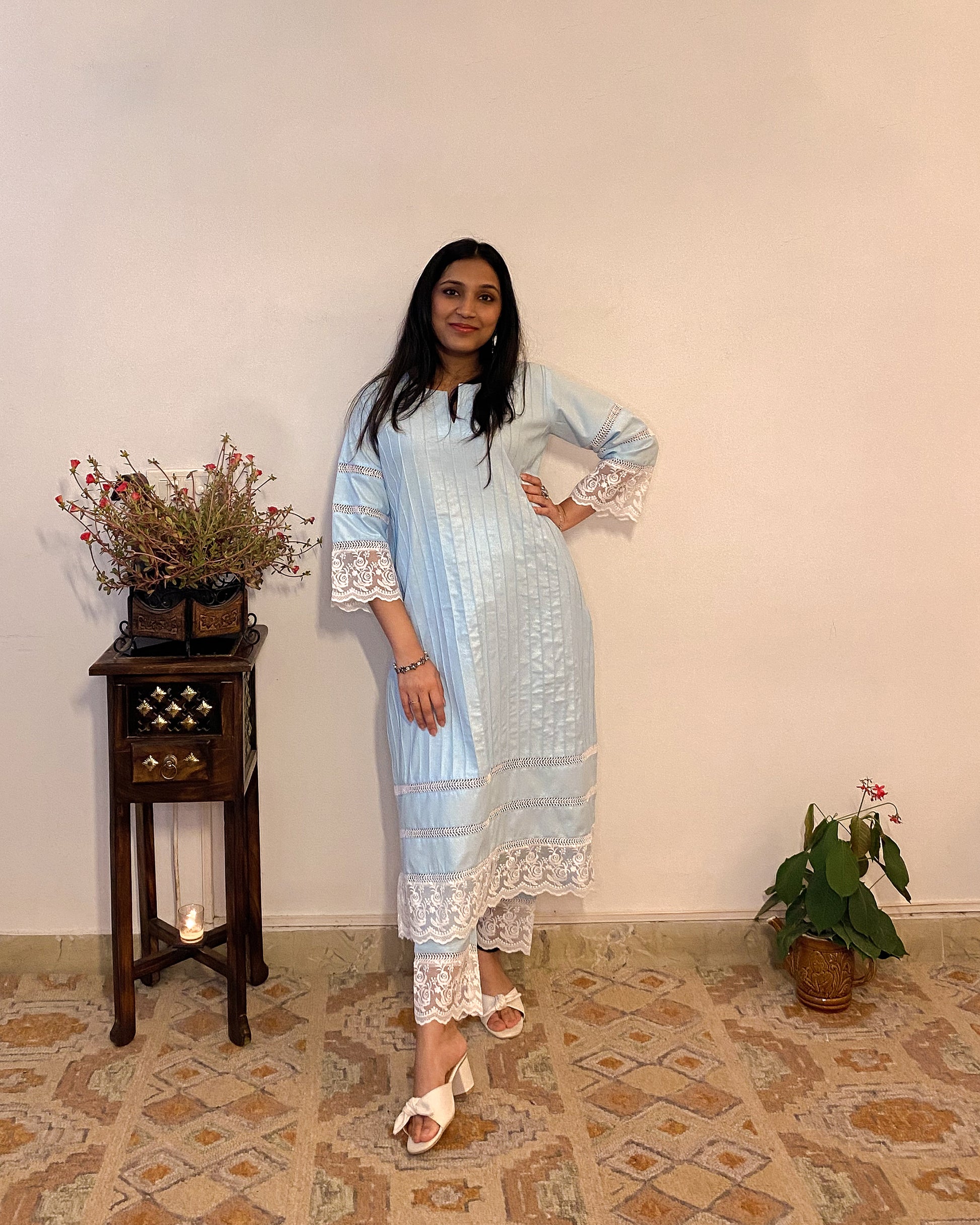 Parinaaz: Powder Blue Cotton Lace Detailed Kurta with Pants (Set of 2)