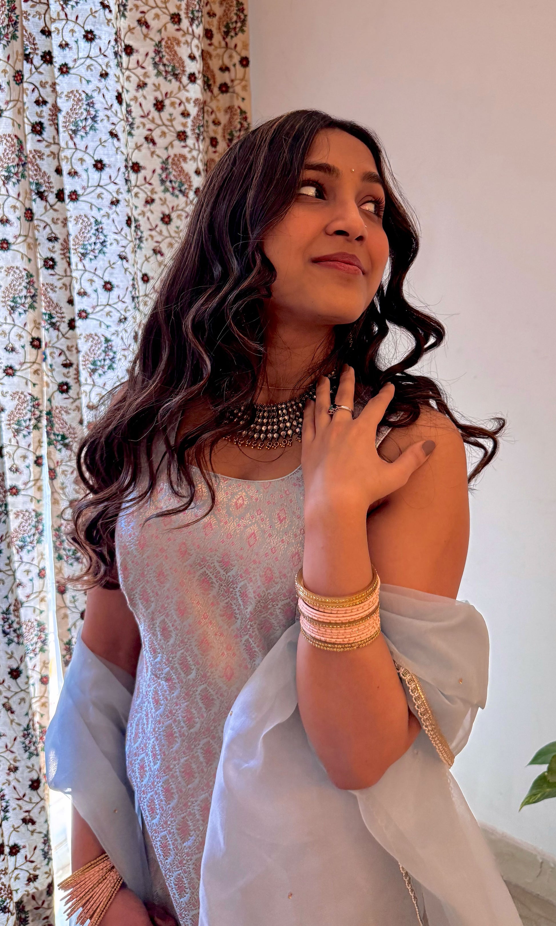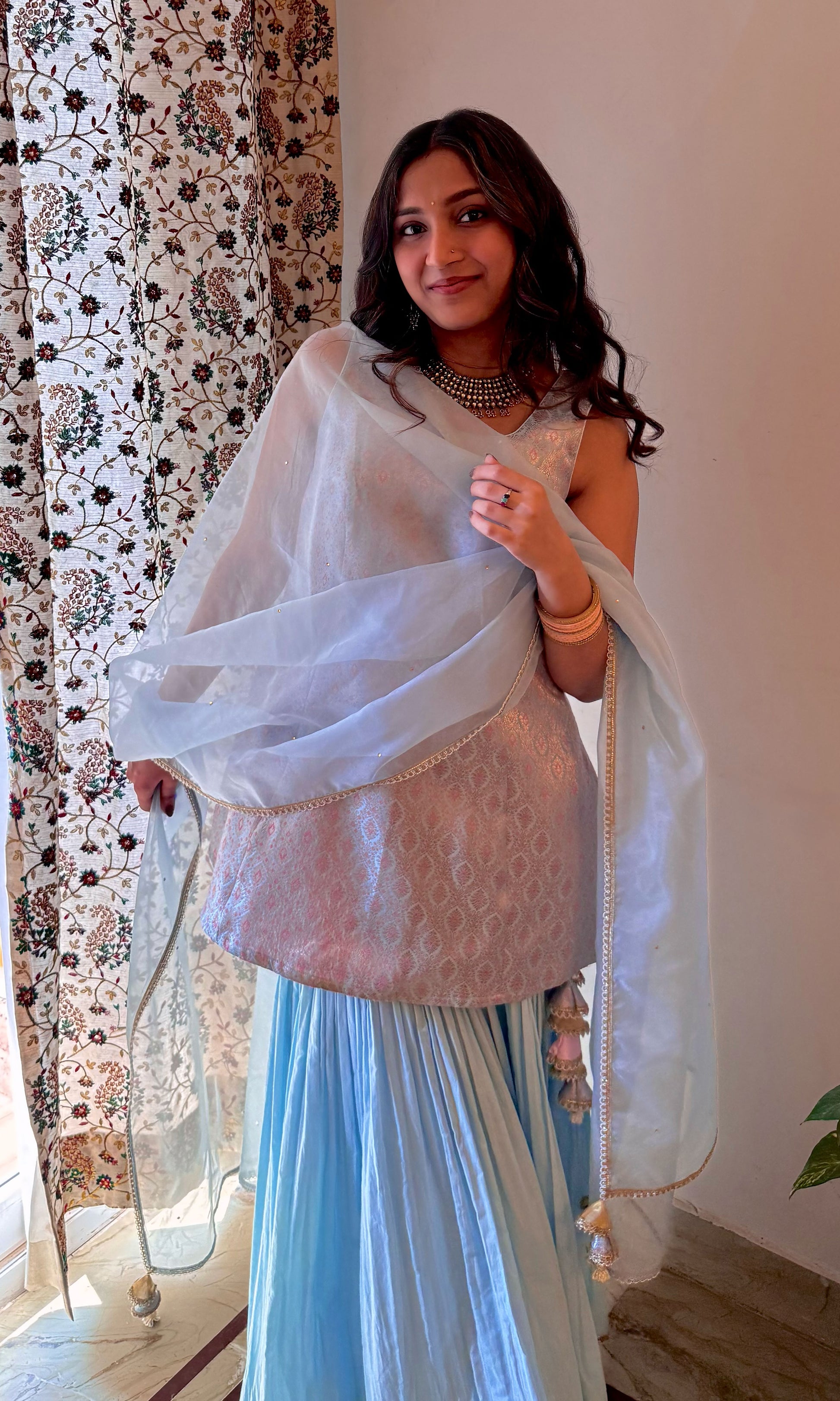 Zara: Powder Blue Brocade and Chanderi Kurta with Sharara and Dupatta (Set of 3)